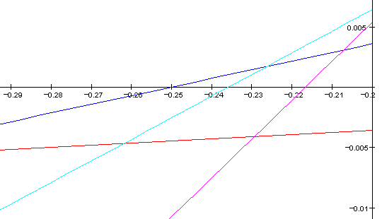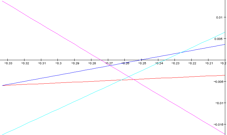 Note that, at 1/4 comma meantone, the major third is exactly "in tune". And, at 1/3 comma meantone, the minor third is exact. This is illustrated by the red and blue lines crossing. Surprisingly enough, fifths are just in Pythagorean intonation.