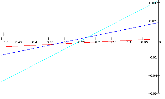 The y (vertical) axis shows how sharp an interval is. Don't worry about the units, but be aware that they're the same for all these types of graphs that I'm showing you. The x axis shows the k- in k-comma meantone. So, 1/4 comma meantone has k=-0.25. The closer k gets to zero, the closer the tuning gets to Pythagorean.