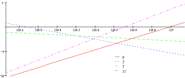 The y (vertical) axis shows how sharp an interval is in cents. The x axis shows the size of the secor in cents. I've shown 9 rather than 3 because that's what you use to compare 11-limit intervals. The left hand edge of the diagram is 31-equal, and the right hand side is 41-equal. 72-equal has a secor of 116.7 cents, which is close to where all the points converge in the middle, and therefore where the best temperaments are.